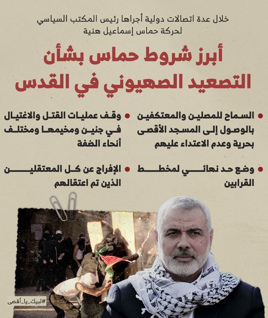 ومن جانبها اصدرت حركة "حماس" عن محاورات رئيس مكتبها السياسي الدولية والإقليمية فقالت إن "هنية هاتف المسؤولين في المخابرات المصرية لمتابعة الأوضاع الخطيرة في القدس والمسجد الأقصى"، وأشارت إلى تأكيده في اتصاله "أن الشعب الفلسطيني والأمة الإسلامية لا يمكنهم تمرير مخططات الاحتلال".