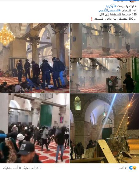 وفجر الجمعة، أصيب العشرات واعتقل المئات بعدما اقتحمت قوات الاحتلال الإسرائيلي، باحات المسجد الأقصى المبارك، وقمعت بعنف المصلين وسط اندلاع مواجهات شديدة.