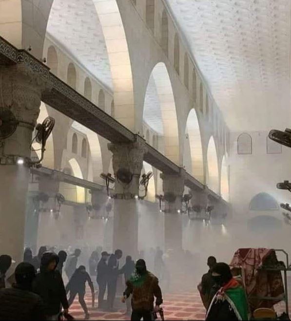 واعتلت أعداد همجية من قوات الاحتلال أسطح المباني الغربية الملاصقة للمسجد الأقصى مستهدفة الفلسطينيين بالرصاص المطاطي، ودنسوا المسجد الأقصى المبارك عندما هاجموا بالمئات؛ المرابطين بقنابل الغاز والرصاص المطاطي، واعتدوا على الصحفيين والطواقم الطبية، وحطموا النوافذ الزجاجية التاريخية وذلك لإطلاق النار على المصلين من خلالها وعشرات الإصابات.