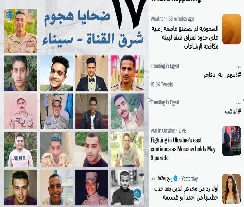 واعتبر وضوح (@Eriel_224) قتل الجنود المصريين معادلة من العسكر لبقائهم في التسلط على المصريين ، شوية عساكر شباب يموتوا ، عشان مجلس العواجيز يعيش ، هم شايفينها معادلة عادلة ".