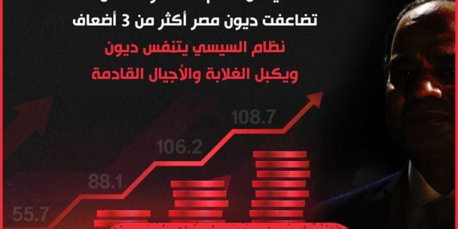 وأضاف أن "العسكر يغرقون مصر بالديون وفي آخر 3 شهور فقط من عام 2021 وقبل الغزو الروسي لأوكرانيا تقفز ديون مصر الخارجية 8.1 مليار دولار ، اقترضهم السيسي وعصابته لسد عجز الحساب الجاري والميزانية ".