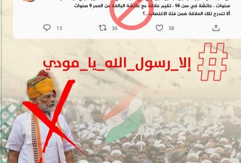 تصدر هاشتاج #إلا_رسول_الله_يا_مودي الأعلى تداولا في مصر بنحو 500 ألف تغريدة مع كلمات مفتاحية عن ذات القضية وهي "عُبّاد البقر" وهي إشارة إلى حزب بهاراتيا جناتا الهندوسي الحاكم في الهند الذي تجرأ من خلال تصريحات المتحدث باسمه بعد تعليقات مسيئة للنبي الكريم محمد، في اعتداء متجدد على رسول الله محمد صلى الله عليه وسلم.