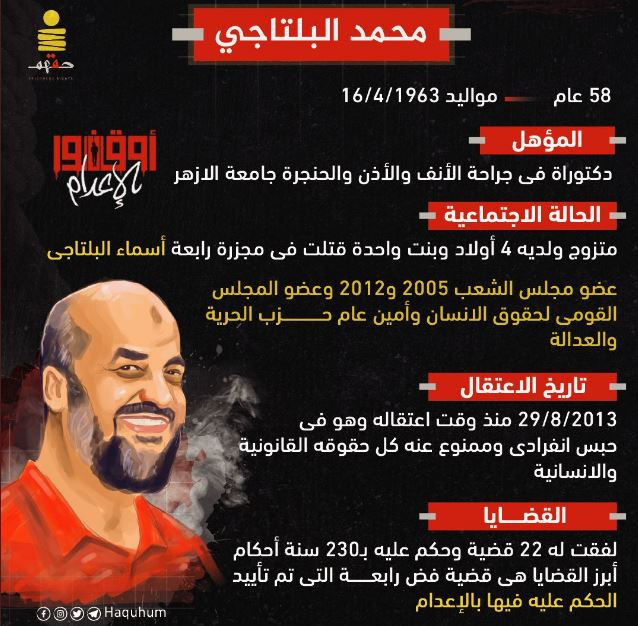 يذكر أن البلتاجي ممنوع من الزيارة منذ اعتقاله ومحبوس انفراديا في زنزانة غير صالحة للاستخدام الآدمي ورغم تدهور حالته الصحية داخل محبسه ، ترفض سلطات الانقلاب السماح بحصوله على حقه في العلاج إمعانا في التنكيل ضمن مسلسل الانتهاكات التي يتعرض لها على مدار 9 سنوات دون توقف حتى الآن.