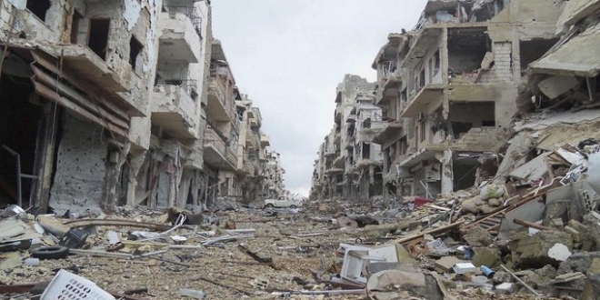 (أولها) محاولة الدعاية بأن هذه المدن تدمرت بفعل الارهاب في إشارة لكفاح الشعب السوري ضده، لا بسبب قصف جيشه والجيش الروسي والمرتزقة لهذه المدن.