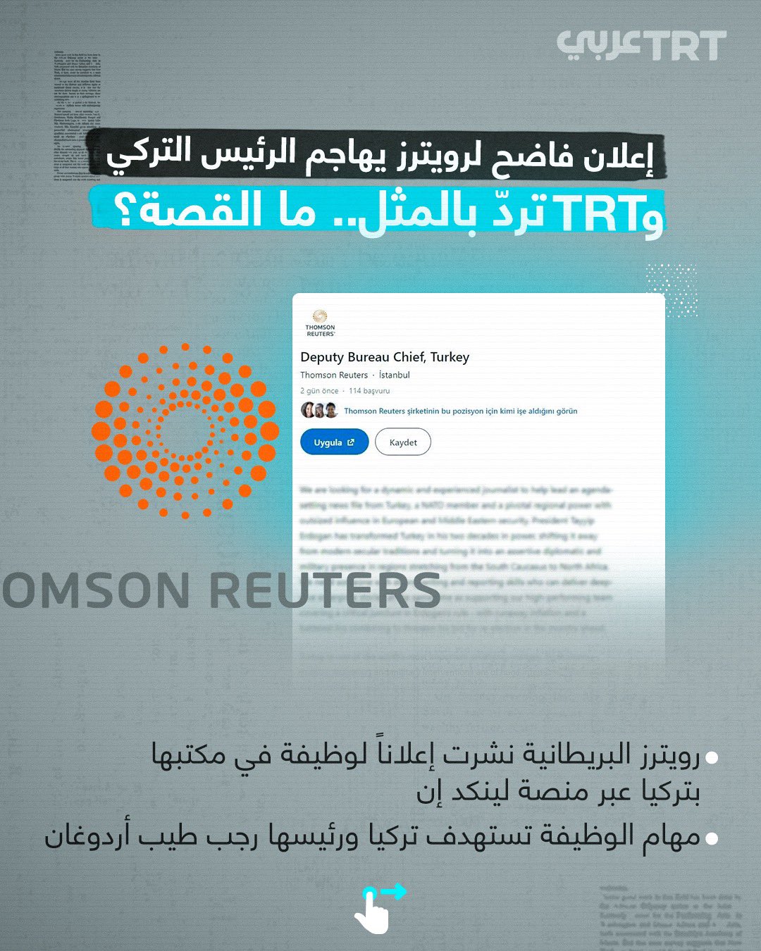 وكالة أنباء رويترز البريطانية أعلنت عن وظيفة شاغرة تحت عنوان “نائب لرئيس مكتب تركيا” عبر منصة LinkedIn استهدفت من خلاله الرئيس التركي رجب طيب أردوغان.