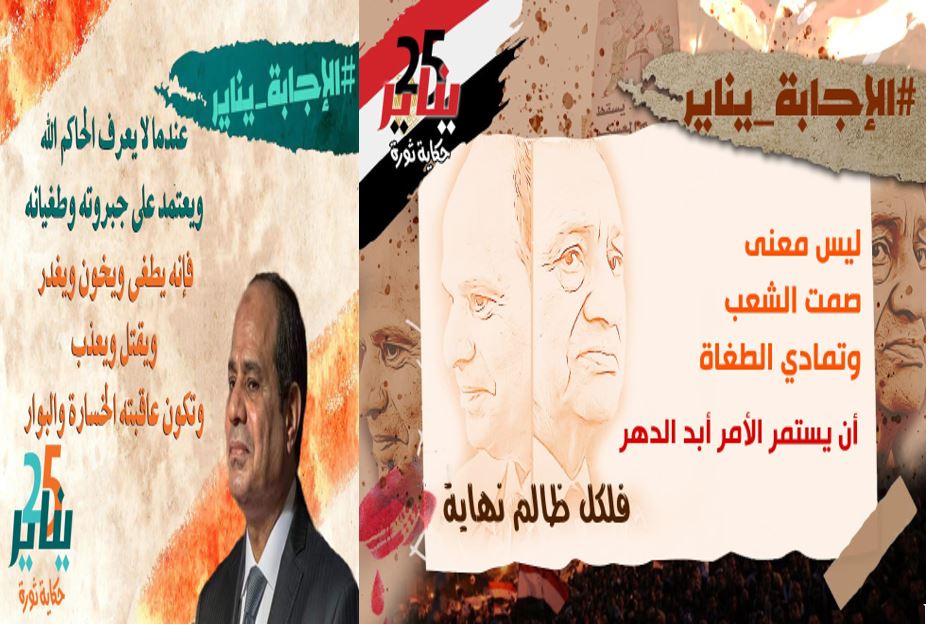 أطلق ناشطون هاشتاج الإجابة_يناير ليتصدر موقع التواصل الاجتماعي للتغريدات "تويتر" أمام هجمة السيسي على ثورة يناير وادعاء أنها أرادت إسقاط الجيش والشرطة.