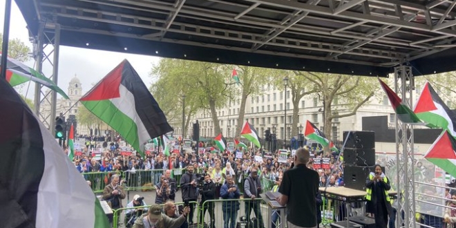 كما رفع مؤيدون لفلسطين أعلام فلسطين ولافتات مطالبة بتحريرها خلال مسيرة لإحياء ذكرى النكبة الخامسة والسبعين في مانشستر، بريطانيا.