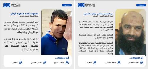 إلى ذلك رصدت لجنة عدالة التي تتخذ من جنيف مقرار لها حالتي اختفاء قسري لمواطنين اثنين في مدينة العريش بمحافظة شمال سيناء بـمصر، أحدهما يعمل بشركة الكهرباء بالعريش تم القبض عليه عام 2017، والآخر يعمل فني أول شؤون هندسية بمجلس مدينة العريش وتم القبض عليه عام 2015.
