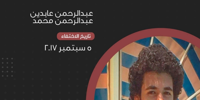 وفي القاهرة أيضا ترفض سلطات الانقلاب الكشف عن مصير الشاب عبدالرحمن عابدين عبدالرحمن محمد الذي تم اعتقاله يوم 5 سبتمبر 2017 بعد توقيفه في كمين للشرطة بنفق الشهيد أحمد حمدي بمدينة السويس.