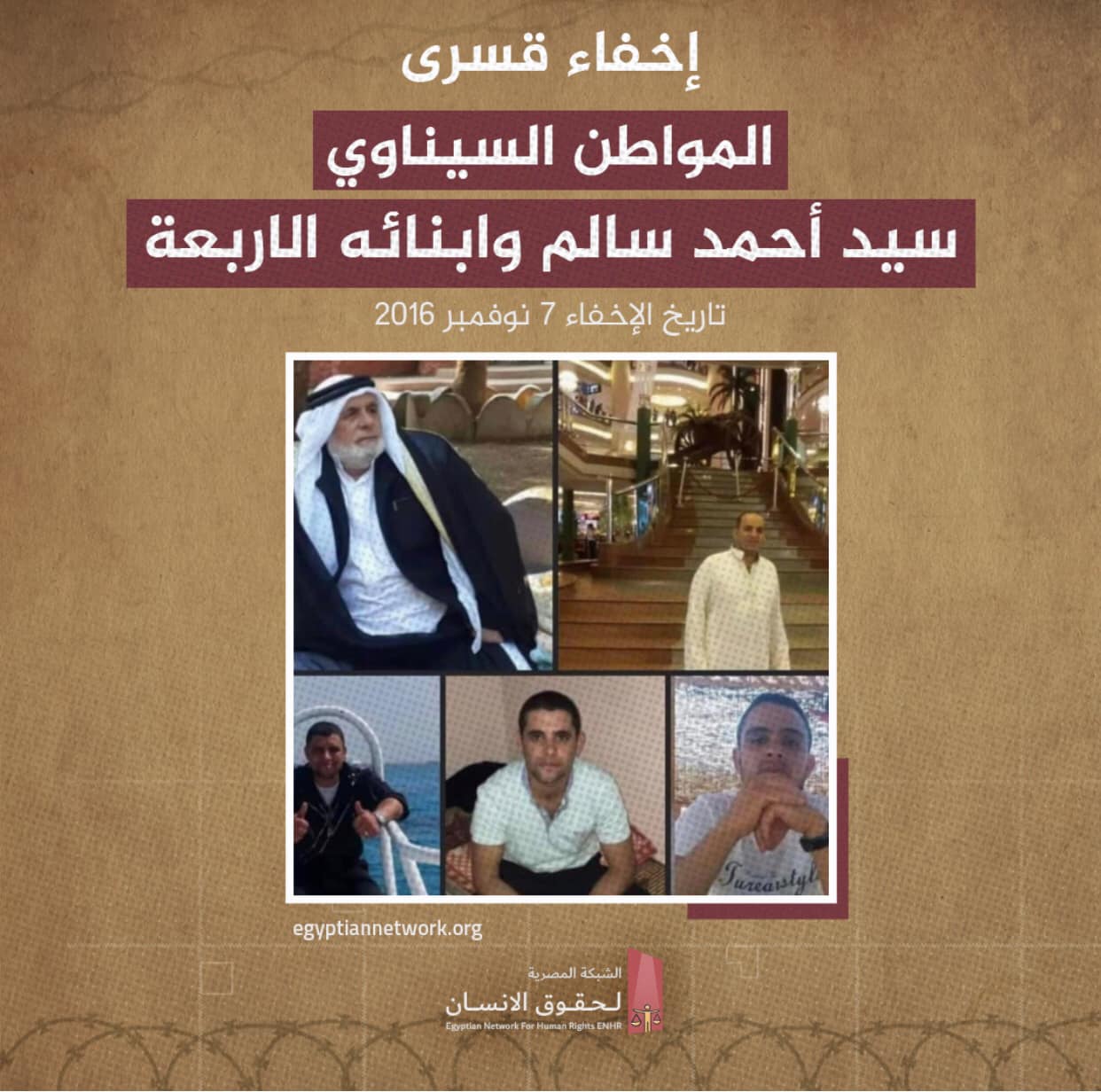 وذكرت أن أسرة المواطن السيناوي سيد أحمد سالم مازالت تعاني مرارة البعد و الفقد بفقدانها 5 رجال من الأسرة، وذلك بعد أن قامت قوة مشتركة من الجيش والشرطة باقتحام منزل المواطن السيناوي الحاج سيد أحمد سالم واعتقاله وأربعة من أولاده تعسفيا و إخفائهم قسرا .