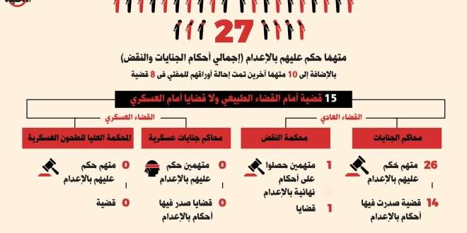 وذكرت أن أحكام الإعدام صدرت من محكمة الجنايات في 14 قضية، شملت 26 شخصا فضلا عن صدور حكم نهائي بالإعدام من محكمة النقض في قضية واحدة لشخص واحد.