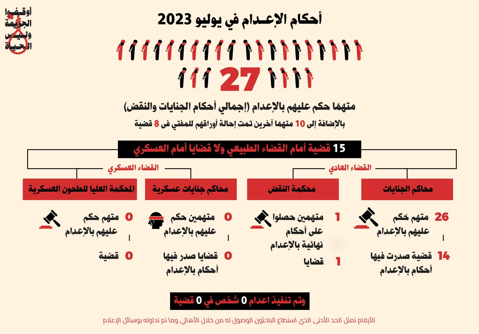 أصدرت “المبادرة المصرية للحقوق الشخصية” تقريرها الإحصائي الشهري ، بشأن عقوبة الإعدام في مصر، رصدت فيه صدور 27 حكما بالإعدام خلال يوليو الماضي 2023 ، إضافة لإحالة أوراق 10 مواطنين آخرين في 8 قضايا إلى مفتي العسكر تمهيدا للحكم بإعدامهم.