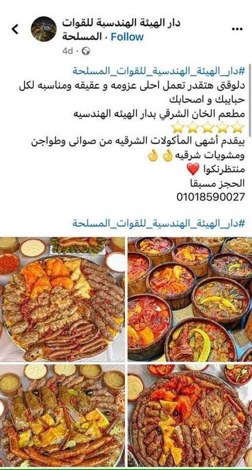 تضمنت إعلانات حديثة عن دار الهيئة الهندسية بالقاهرة، ترويجا لأحد المطاعم الذي يقدم أشهى المأكولات الشرقية من طواجن وصواني ومشويات شرقية، في وقت يتعرض فيه قطاع غزة لحرب إبادة ينعدم فيها الغذاء والدواء والكهرباء والوقود، مما يهدد عاجل أم آجلا أمن مصر القومي من العدو الصهيوني.