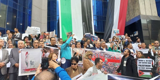 وقف المتظاهرون خارج مدخل النقابة لمدة ساعة للمطالبة بوقف إطلاق النار ورفض التهجير القسري الجماعي للفلسطينيين إلى مصر.