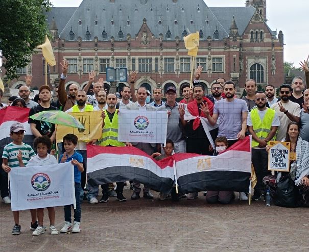 نظم أحرار رابعة العدوية وقفه شارك فيها مصريين هولنديين أمام محكمة العدل الدولية لاهاي لإحياء الذكري الحادية عشرة لمذبحة فُض رابعة والنهضة.
