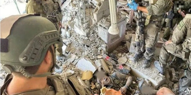 ويظهر في الصورة التي نشرتها وسائل الإعلام الإسرائيلية عددا من الجنود الإسرائيليين يحيطون بجثة يحيى السنوار داخل مبنى في تل السطان في رفح.