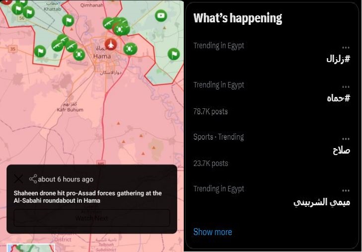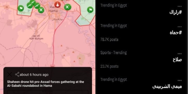 تصدر هاشتاج #حماة على (إكس) في مصر بنحو 100 ألف تغريدة بعد اعتراف جيش النظام بخروج قواته من حماة معلنا إعادة تموضعها خارج المدينة، وبعد تحرير 3 آلاف سجين في سجن حماة المركزي واستقبال أهالي حماة الثوار بالزغاريد.