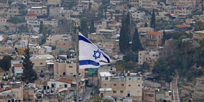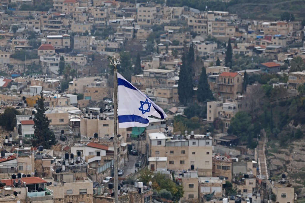 A general view taken from the Mount of Olives shows an Israeli flag with houses in Jerusalem's predominantly Arab neighbourhood of Silwan appearing in the background, on January 2, 2023. (Photo by AHMAD GHARABLI / AFP)