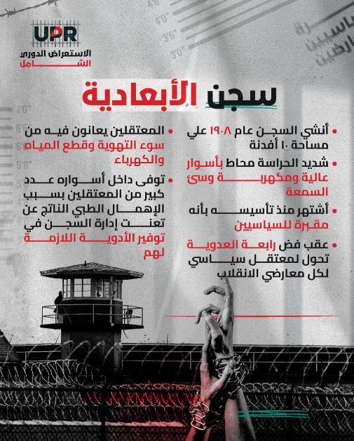 قال حقوقيون إن سجن الابعادية (شديد الحراسة) بدمنهور أنشئ في سنة 1908 على مساحة 10 أفدنة محاطا بأسوار عالية، وضمن الاستعراض الدوري الشامل لملف مصر لحقوق الإنسان منحت الفرصة للمنظمات الحقوقية في مصر إلى إظهار الوجه الأكثر سوءا للانقلاب في مصر لسجونه ومنها الابعادية الذي أُشتهر منذ تأسيسه بأنه مقبرة للسياسيين.