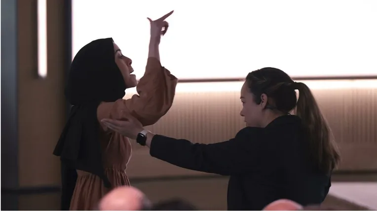 وقالت بصوت عالٍ موجهة حديثها إلى سليمان: "عار عليك. أنت مستغل للحرب ضد غزة. توقف عن استخدام الذكاء الاصطناعي للإبادة الجماعية".