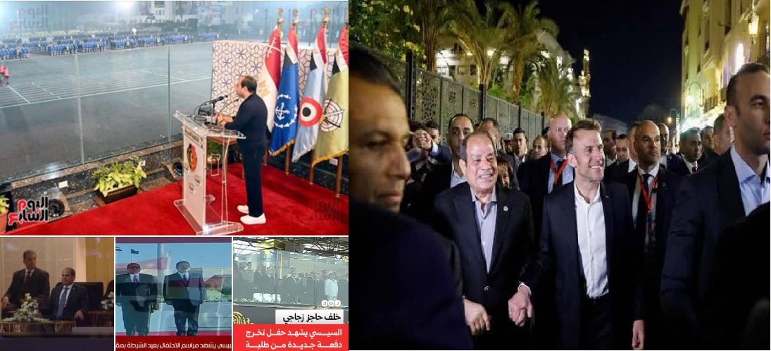 جدول زيارة معد سلفا تضمن تباهي المنقلب السيسي والجوقة الإعلامية بالسير وسط حشود أمنية غير مسبوقة مع إخلاء منطقة خان الخليلي بالكامل من السياح في حين أن السيسي يظهر بين طلاب الكلية الحربية من خلف حائط زجاجي دأب على استخدامه مرات.
