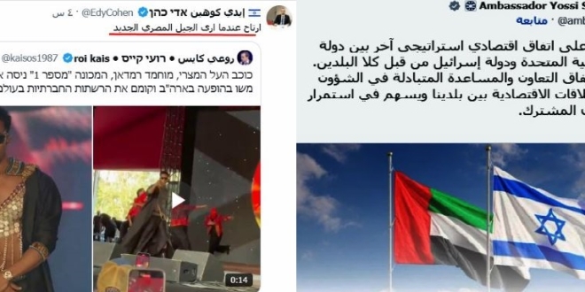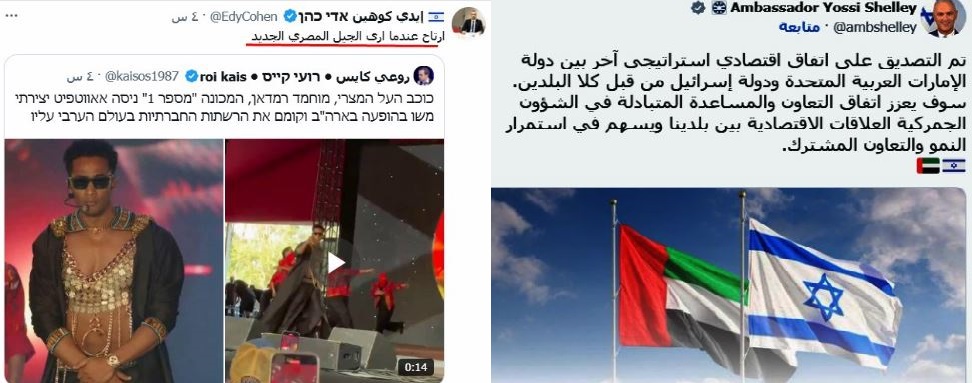 على صعيد "الانسحاقات" العربية التي تعطي الصهاينة إحساسا بـ"انتصار" زائف، علق الإعلامي الصهيوني إيدي كوهين الذي كان في إفادة له أمام الكنيست (أكثر من مجرد صاحب هرتلة على حسابه الرسمي على إكس وفيسبوك) عن بدلة الرقص التي ارتداها الممثل المصري محمد رمضان خلال حفل بالولايات المتحده قائلا بالعربية على منشور زميله المكتوب بالعبرية: "ارتاح عندما ارى الجيل المصري الجديد"!