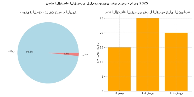 وفيما يلي رسم بياني يوضح توزيع المحتجزين حسب الجنس وفترة الاختفاء القسري: