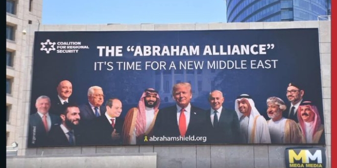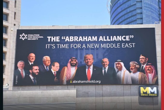 في مشهد دعائي غير مسبوق، تصدّر إعلان ضخم في شوارع "تل أبيب" صور عدد من زعماء الدول العربية، تحت شعار: "تحالف إبراهام – الشرق الأوسط الجديد"، في محاولة إسرائيلية مكشوفة لإعادة بعث مشروع التطبيع العربي مع الاحتلال، رغم إخفاقاته المتراكمة منذ اندلاع "طوفان الأقصى" في 7 أكتوبر 2023.