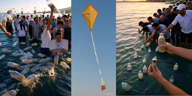 تصدرت مبادرة إلقاء زجاجات معبأة بالحبوب والبقول بعنوان "من البحر إلى البحر" منصات التواصل الاجتماعي في وقت عبّرت فيه المبادرات إلى رمزية عظيمة، أمام إغلاق حكام مصر والعرب الأبواب بوجه إغاثة غزة.