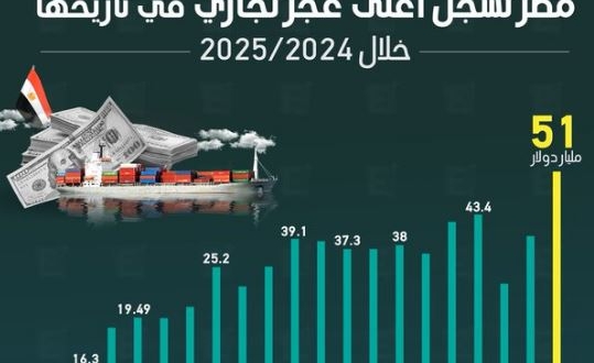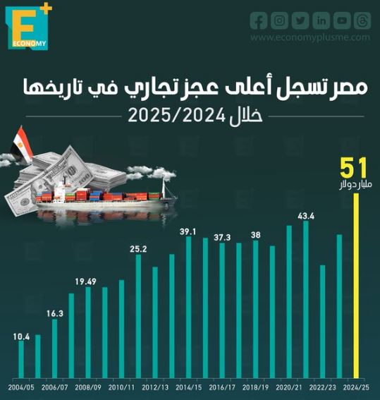 وخلال 2025/2024 أعلن البنك المركزي أن العجز التجاري وصل لأعلى مستوى بـ51 مليار دولار وهو العجز بين الصادرات والواردات منذ 12 سنة.
