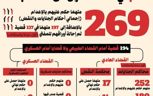 فبحسب تقرير مركز الشهاب لحقوق الإنسان، أصدرت محاكم الانقلاب منذ استيلاء السيسي على السلطة في يوليو/تموز 2013 أكثر من 2300 إحالة إلى المفتي، و1613 حكماً نهائياً بالإعدام في قضايا ذات طابع سياسي، نُفذ منها فعلياً 105 أحكام. أرقام تكشف أن النظام لا يحكم بالعدل، بل بالانتقام، وأنه يستعمل القضاء العسكري ودوائر الإرهاب كسلاح لتصفية خصومه السياسيين.