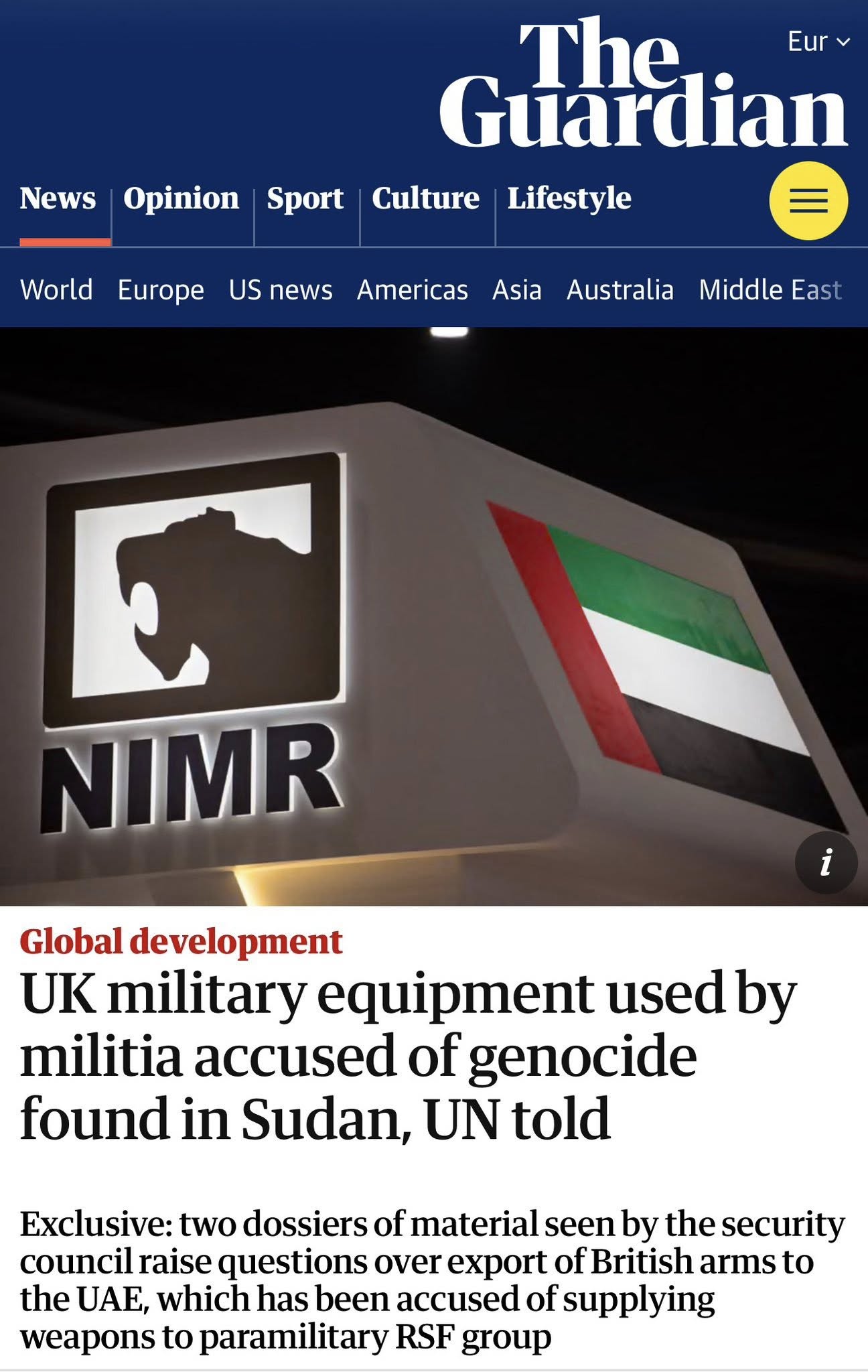 قالت صحيفة الجارديان The Guardian" " إن الولايات المتحده وبريطانيا تحققان في كيفية وصول اسلحه بريطانيه وأمريكية متطوره جدا تم العثور عليها لدى عناصر قوات الدعم السريع " وكشفت التحقيقات أن الاسلحه تم بيعها للامارات وفق تصريحات خاصه قبل ان تقوم بنقلها لقوات الدعم السريع من أجل تغيير ميزان القوى على الارض في السودان.