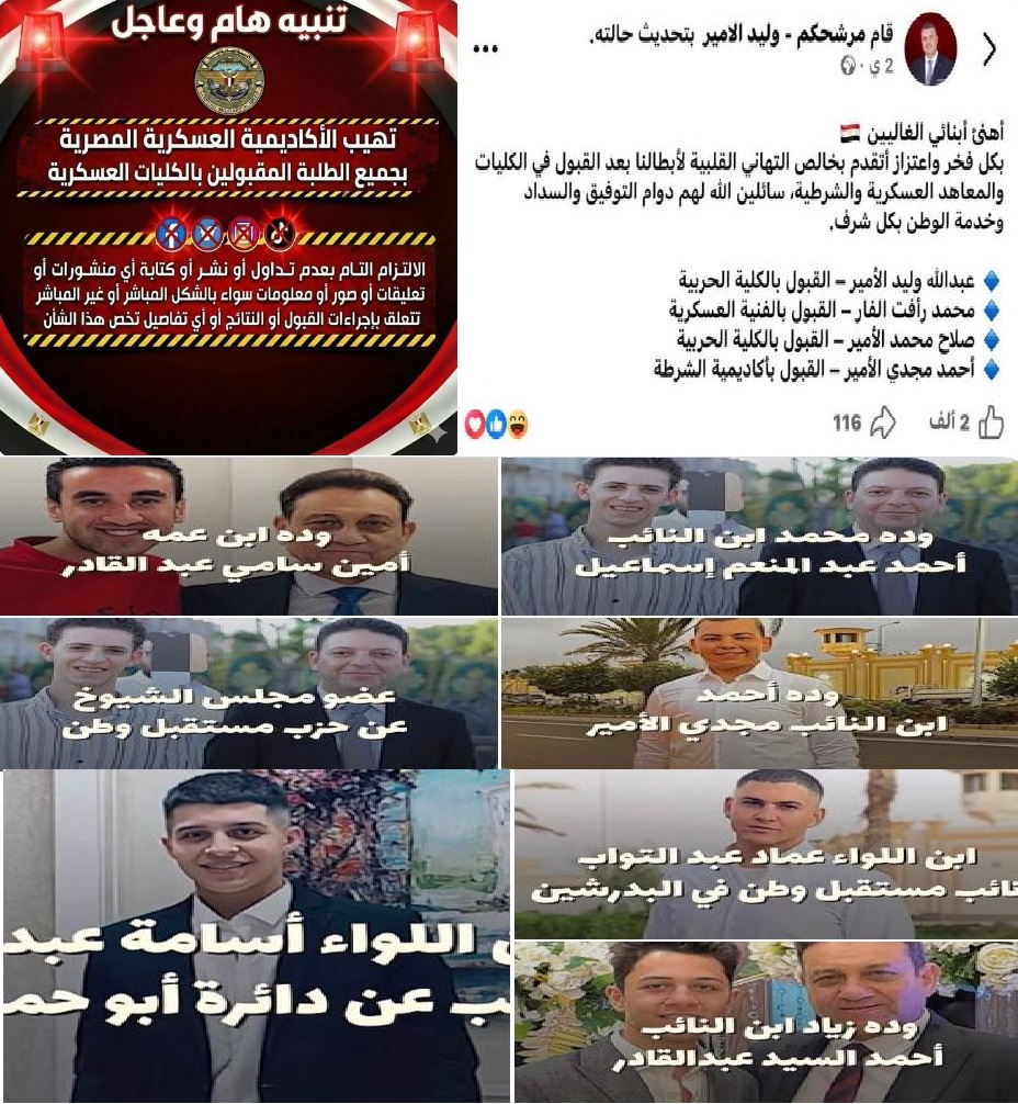 التهاني التي زفها المرشحون لنواب العسكر بقبول أبنائهم في الأكاديمية والسادة اللواءات كانت فاضحة ولذلك أصدرت (الأكاديمية العسكرية المصرية) الاسم الجديد لكلية الشرطة بالمقبولين من الطلاب (وبالتبعة أسرهم) نشر أي شيء يتعلق بنتائج القبول أو حتى الاجراءات التي أوصلتهم إلى نجاح الالتحاق بالكلية، وهو ما فسره مراقبون على مواقع التواصل الاجتماعي بأنه محاولة لملمة الفضائح بالانقسام الشعبي بين فئة كان عنوانها المحددات السالفة.