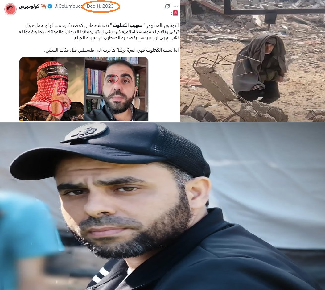 وأعادت حسابات ناطقة بالعربية (غير معلوم هويتها) مثل حساب (@Columbuos) في 11 ديسمبر 2023 ما أدعاه "أدرعي" الذي صدق وهو كذوب، مشيرا إلى أن "اليوتيوبر المشهور" صهيب الكحلوت " نصبته حماس كمتحدث رسمي لها ويحمل جواز سفر تركي وتقدم له مؤسسة اعلامية كبرى في استديوهاتها الخطاب والمونتاج، كما وضعوا له لقبا عربيا ابو عبيده، ويقصد به الصحابي ابو عبيدة الجراح.. أما نسب الكحلوت فهي اسرة تركية هاجرت الى فلسطين قبل مئات السنين".