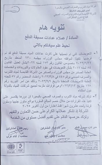 الوثيقة التي ظهرتها في الصورة هي إشعار رسمي صادر عن: شركة مياه الشرب والصرف الصحي بالجنوب – الهيئة القومية لمياه الشرب والصرف الصحي – وزارة الإسكان والمرافق والمجتمعات العمرانية.