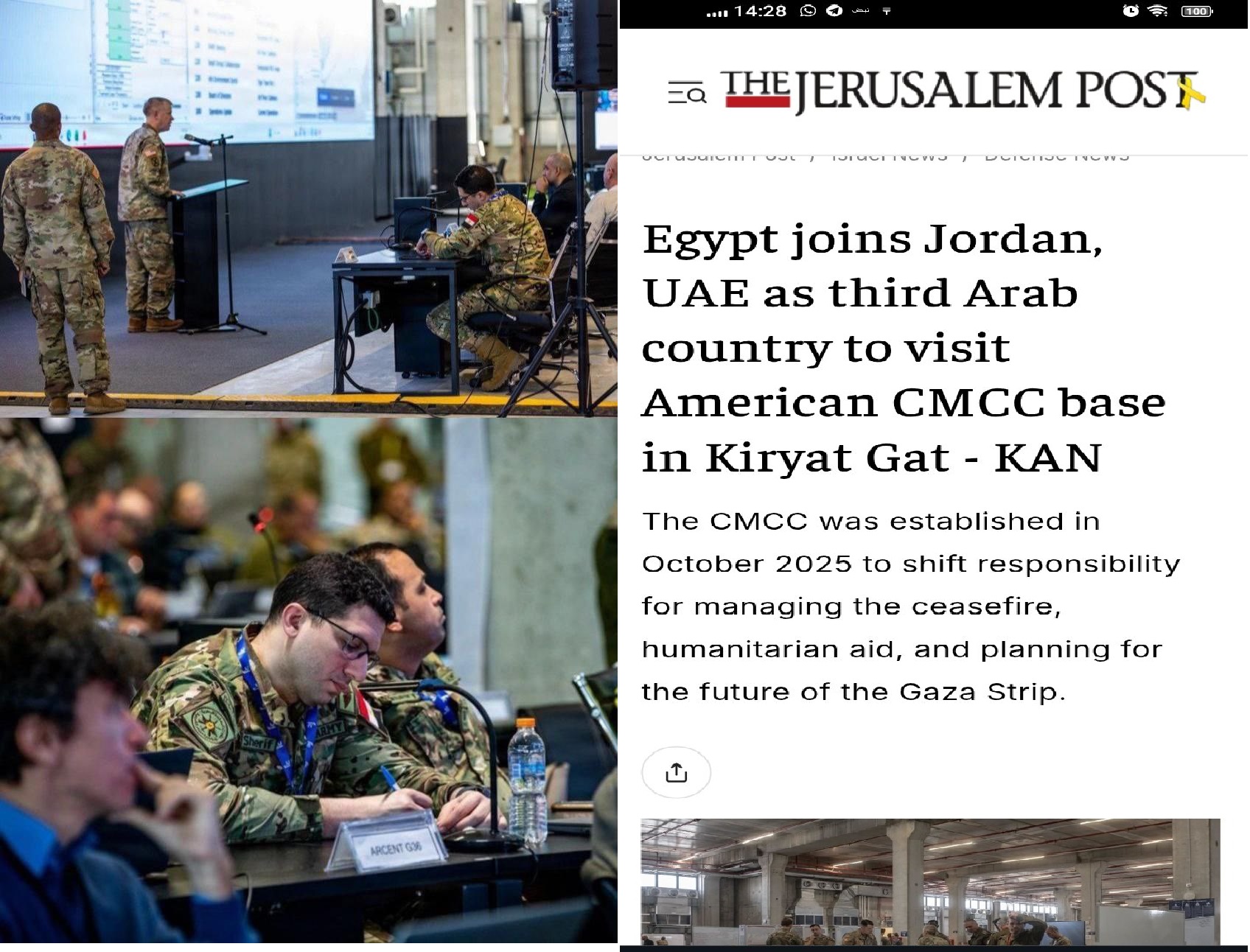 نشرت القدس بوست (Jerusalem Post) تقارير منتصف يناير 2026 عن وجود ضباط مصريين داخل قاعدة أميركية في مدينة كريات جات داخل الكيان، ضمن ما يسمى "مركز التنسيق المدني العسكري – CMCC"، وهو مركز أنشئ في أكتوبر 2025 في تل ابيب لإدارة وقف إطلاق النار في غزة والإشراف على المساعدات الإنسانية.