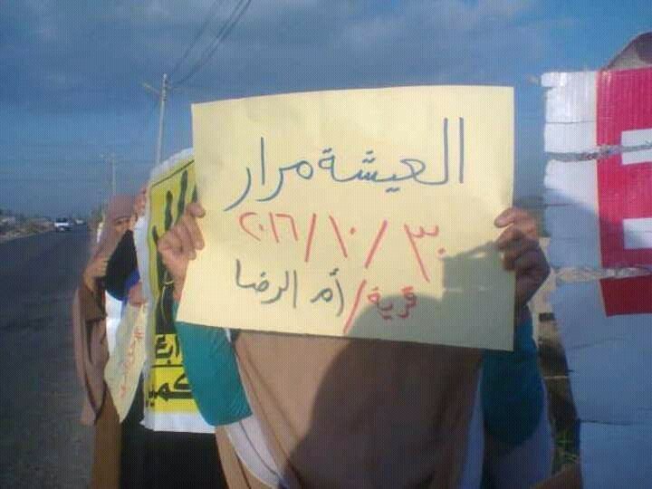 بلافتات الثورة تجمعنا وإيد واحدة بجوار علم مصر وصور الشهداء والمعتقلين وصور الرئيس محمد مرسي امتدت سلسلة بشرية ووقفة احتجاجية لحرائر دمياط على طريق دمياط جمصة الزراعي من أمام قرية أم الرضا استمرارًا لمظاهرات العيشة مرارًا ضمن موجة ارحل الممتدة.
