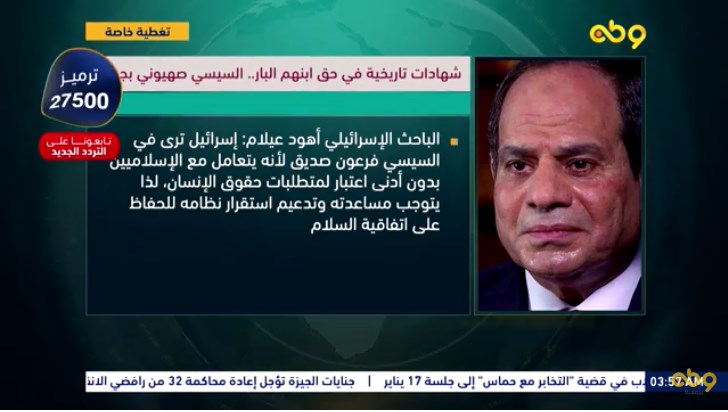 اعترف قائد الانقلاب العسكري عبد الفتاح السيسي، بتعاونه العسكري الوثيق مع دولة الاحتلال الإسرائيلي بشبه جزيرة سيناء بذريعة مكافحة الإرهاب. وقال السيسي، خلال مقابلة تلفزيونية مع برنامج 60 ...