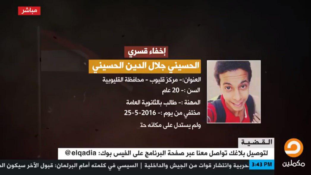 ناشدت والدة الطالب الحسيني جلال الدين الحسيني (20 سنة)، من مركز قليوب بمحافظة القليوبية، والمختفي قسريا منذ 25 مايو 2016، سلطات الانقلاب الكشف عن مكان احتجازه. وأضافت والدة ...