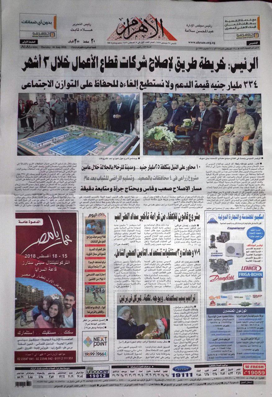 الموضوع الأبرز الذي حظي باهتمام جميع الصحف والمانشيتات هو افتتاح السيسي ما وصفه مانشيت الأهرام بمشروعات عملاقة لتنمية الصعيد وهي قناطر أسيوط ومتحف سوهاج و25 بئرا بالوادي الجديد. ...