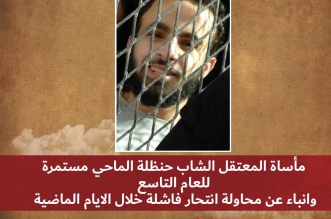 ‎أقرأ المزيد التعليقات على عقب محاولة انتحار فاشلة.. نقل المعتقل الشاب حنظلة الماحي لمستشفى السجن مغلقة