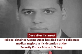 كشفت الشبكة المصرية لحقوق الإنسان، عن استشهاد المعتقل السياسي أسامة عامر، مدرس اللغة العربية بمدرسة رفاعة الثانوية العسكرية بمدينة طهطا بمحافظة سوهاج، وذلك بعد أيام من ...