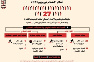 27 حكما بالإعدام وإحالة أوارق 10 آخرين للمفتي خلال يوليو الماضي