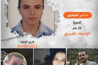 تواصل قوات الانقلاب بالجيزة إخفاء الشاب آسر محمد علي الطبلاوي، ٢٦ عاما، طبيب بيطري منذ اعتقاله من منزله في مدينة ٦ أكتوبر محافظة الجيزة دون سند من القانون بتاريخ ...