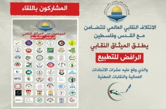 وقّع عشرات الاتحادات العمالية والنقابات المهنية، ممثلين عن ملايين العمال والنقابيين في العالم، على "الميثاق النقابي الرافض للتطبيع"، بحضور أمين منبر الأقصى الشيخ عكرمة صبري، ضمن حملة توقيع ...