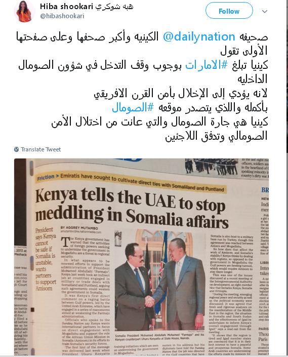 تداول ناشطون صوماليون عبر الإنترنت، صورة لافتتاحية صحيفة “ديلي نيشن” الكينية، توضح رفض كينيا الدور الإماراتي العابث في الصومال. ووفقا للصورة المتداولة، فقد جاء المانشيت الرئيسي بعنوان: كينيا ...