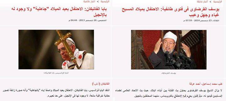 نشر نشطاء على موقع التواصل الاجتماعي، خبرين من صحيفة واحدة هي اليوم السابع، والذى تناول فتوى الأولى كانت للبابا فرانسيس بابا الفاتيكان حول رفضه احتفالات عيد الميلاد والتى ...