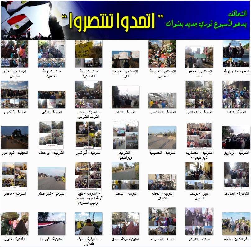 كتب: أحمد علي انتفض ثوار المحافظات ليلا من بئر العبد بشمال سيناء، و6 أكتوبر بالجيزة، وشبر الخيمة بالقليوبية، وأويش الحجر بالدقهلية، وبلطيم بكفر الشيخ، والعاشر من رمضان وأبوحماد ...