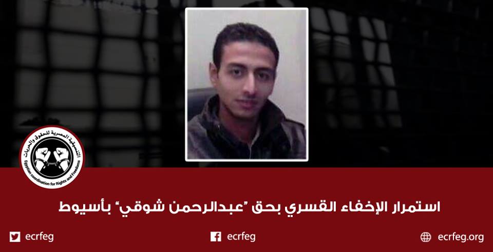 تواصل مليشيات أمن الانقلاب بأسيوط، إخفاء الشاب عبد الرحمن شوقي “28 عامًا”، لليوم الـ208 على التوالي، منذ اعتقاله يوم 28 يوليو الماضي من مقر عمله بشركة كريازي. من ...